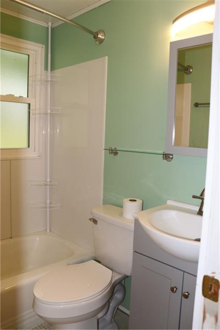 bathroom. New front concrete steps and wooden deck.